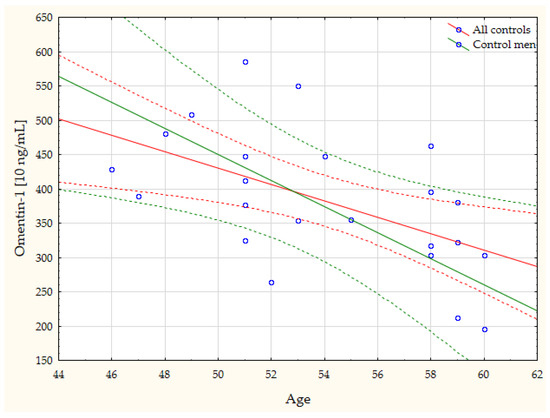 Negative linear correlations between age and omentin-1 concentrations in the controls (r = −0.54, p = 0.008), including the males in this group only (r = −0.78, p = 0.023).