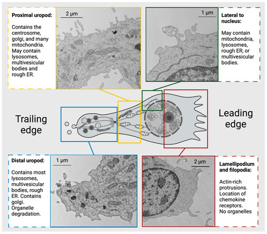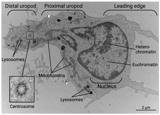 Transmission Electron Micrograph of a migrating human CD4+ T cell with a polarized morphology. The leading edge contains an actin-rich lamellipodium and filopodia while the uropod contains many organelles such as mitochondria, lysosomes, and rough ER on microtubule tracks. The centrosome separates the distal and proximal uropod in the trailing edge on the left. Created with BioRender.com.