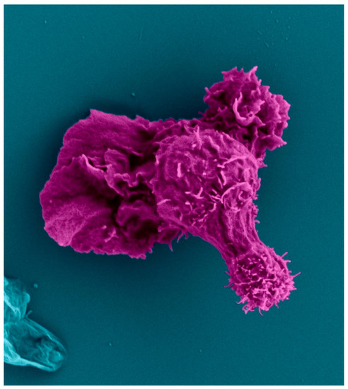 Throughout this paper, we show scanning electron microscopy (SEM) and transmission electron microscopy (TEM) images of human CD4+ T cells that display the polarized structure of migrating cells. The polarized cytoskeleton of a migrating CD4+ T cell allows for the compartmentalization of organelles and biochemical reactions (Figure 3 and Supplementary Figures S1 and S2). At the leading edge, actin-rich protrusions termed lamellipodia and filopodia extend and retract to guide cell movement following signaling through chemokine receptors and integrins along with other adhesion molecules [78]. The cell shown in Figure 4 turns to the left, as seen by the extension of the lamellipodia on the left side and the retraction of protrusions on the right side. This dynamic actin leading edge is directly connected to the nucleus, which takes up a large volume within the anterior of the cell. Figure 5 illustrates the different segments of a migrating CD4+ T cell. There is a general absence of organelles in the leading edge with organelles concentrated in the rear of the cell. The actin at the leading edge is tethered to the nucleus cell by LINC (linker of nucleoskeleton and cytoskeleton) complexes, which cross the nuclear envelope and connect chromatin to actin, microtubules, and intermediate filaments [79]. Posterior to the nucleus, the microtubules and vimentin intermediate filaments provide the cytoskeletal scaffold of the trailing tail of the cell, which has been coined the uropod. Electron microscopic examination of the uropod indicates there are at least two distinct portions of the uropod delineated by the centrosome, which we refer to as the proximal and distal uropod (Figure 4 and Figure 5). Although often overlooked in the literature as a separate region, the distal uropod has been referred to as the uropod “knob” in a few reports [53,80]. In SEM micrographs, the plasma membrane of the proximal uropod is smooth as opposed to the ruffled and filopodia-rich regions of the lamellipodium and distal uropod, respectively. TEM micrographs indicate that the centrosome organizes microtubules which anchor organelles in both the proximal and distal uropod (Supplementary Figure S3).