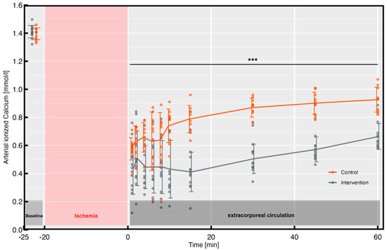 Appropriately, the minimum calcium level was found to be lower in the intervention group than in the control group (0.43 ± 0.17 mmol/L vs. 0.58 ± 0.08 mmol/L, p < 0.05). Different ionized calcium levels could be detected for up to 2 h after the start of reperfusion (intervention group: 0.90 ± 0.18 mmol/L vs. control group: 1.15 ± 0.14 mmol/L, p < 0.001).