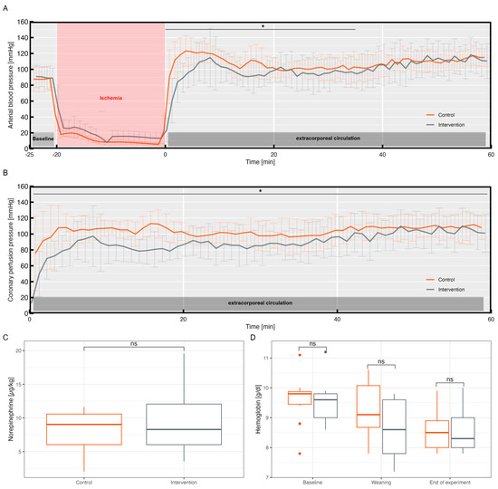 (A): Arterial blood pressure during baseline and first hour of reperfusion. (B): Coronary perfusion pressure during the first hour of reperfusion. (C): Total amount of norepinephrine used during the experiment. (D): Hemoglobin levels at baseline, weaning from extracorporeal circulation, and end of experiment. * p < 0.05. ns = not significant.