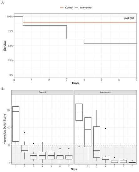 The neurological outcome measured by the NDS showed a good outcome (defined as an NDS < 50) in all animals that survived until day 7 of the experiment, with no difference between both groups (p = 0.87) (Figure 5B).