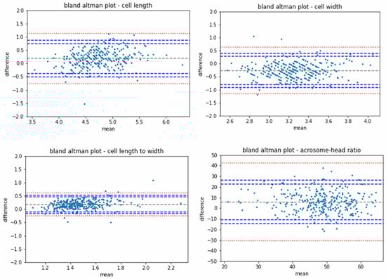 The agreement between the QPM and the reference method was evaluated for 326 sperm cells. The average characteristic values (the median over the mean measurements between the reference and QPM results, for each cell) of the sperm cells evaluated were 4.7 µm head length, 3.2 µm head width, 1.4 length–width ratio and 49% acrosome-to-head ratio. Agreement of the two modalities resulted in biases of 0.18 µm (CI −0.442–0.808 µm, 95%, STD—0.32 µm) for head length, −0.26 µm (CI −0.86–0.33 µm, 95%, STD—0.29 µm) for head width, 0.17 (CI −0.12–0.478, 95%, STD—0.15) for length–width ratio and 5.7 for acrosome–head area ratio (CI −12.81–24.33, 95%, STD—9.6). Bland–Altman plots are presented in Figure 2.