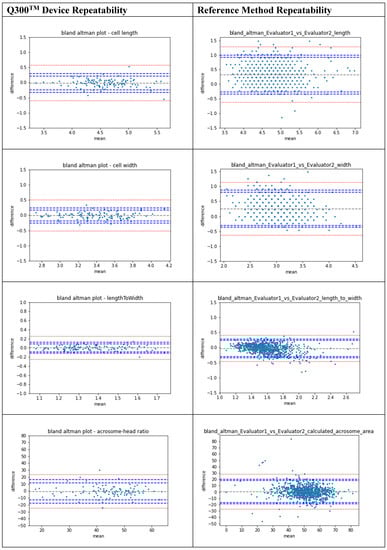 A repeatability evaluation was performed for the QPM system and the reference method with respect to all outcome measures reported by the device (head length, head width, length-to-width ratio and acrosomal-area-to-head-area ratio). For each modality, two measurements were taken per parameter per cell, the agreement between the two measurements for each modality was also presented using Bland–Altman plots and the 95% confidence intervals (1.96XSD) of agreements were calculated. Estimated bias (defined as the mean difference between the 2 methods ± SD) was calculated. To evaluate the difference in sperm cell classification, a sensitivity analysis between the two modalities was performed.