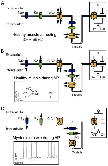 In addition, during intense muscle activity, if the K+ accumulation in the T-tubules induces depolarization of the resting potential, this depolarization can spread along the sarcolemma. However, the presence of ClC-1 channels and the high Cl− conductance of skeletal muscle reduces the membrane resistance (Rm) (right insert in Figure 1B). Small Rm reduces sarcolemmal length constant (λ) and prevents the local propagation of depolarizations []. However, in the absence of functional ClC-1 channels, it is plausible that the increased Rm (right insert in Figure 1C) favors depolarization spreading.