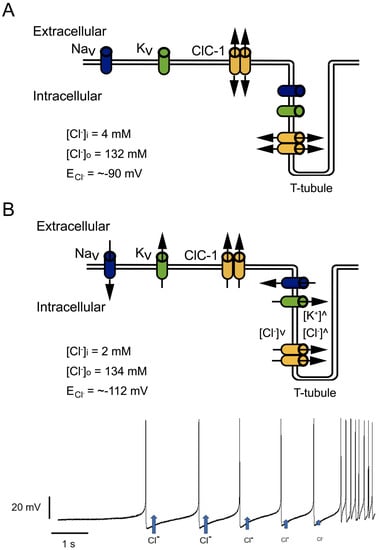 Effect of increased inward but decreased outward currents in Cl− currents. (A) At physiological conditions, Cl− inside and outside concentrations allow an equilibrium potential (ECl−) close to muscle resting potential, where Cl− influx and outflux play a stabilizing role. (B) Mutant channels with pronounced inward rectification allow Cl− outflux during trains of action potentials without influx during action potential repolarization. In this condition, repetitive activity can cause intracellular Cl− depletion and T-tubule Cl− accumulation, progressively decreasing Cl− outflux during repetitive firing (blue arrows getting smaller after each action potential in bottom panel), and shifting ECl− to more negative potentials.