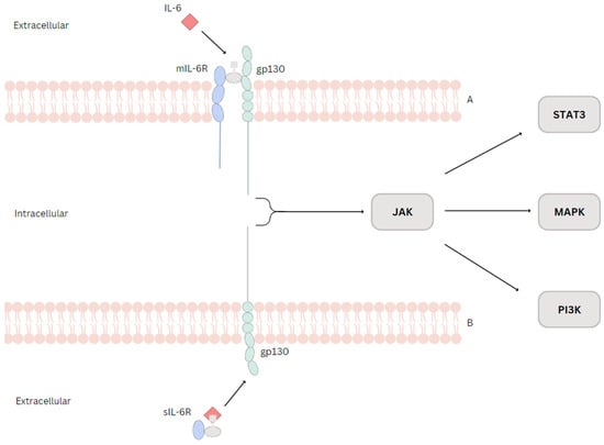 Regarding extracellular signaling pathways, IL-6 can exert classic signaling (Figure 1A) or trans-signaling (Figure 1B). The classical pathway implies the binding of IL-6 with the membrane-bound IL-6 receptor (mIL-6R), a ligand-binding glycoprotein called CD126. mIL-6R is a transmembrane α-chain (80 kDa) consisting of three domains (D1, D2, and D3). The Ig domain, referred to as D1, is connected to the domain responsible for binding cytokines (CBD). Utilizing the CBD, IL-6 attaches to the co-receptor glycoprotein 130 (gp130), forming a hexameric arrangement []. The following point is crucial to highlight: mIL-6R lacks signal-transduction capacity, whereas gp-130 possesses signal-transduction capabilities []. This matter signifies that only gp130 can trigger internal signaling sequences. IL-6 itself does not exhibit any binding affinity toward gp130; therefore, mIL-6R is imperative for the initial binding of IL-6 and the subsequent activation of gp130. Neither the cytoplasmic nor the transmembrane segments of IL-6R hold signaling competence []. mIL-6R is expressed on a few cells (hepatocytes, neutrophils, monocytes, T-cells), while gp130 is expressed on all human cells. This hexameric complex formed by IL-6, mIL-6R, and gp-130 activates Janus kinase (JAK), activating different signaling routes. One signaling route represents the self-tyrosine phosphorylation of JAK, which then induces the dimerization of signal transducer and transcription-3 (STAT3). In an alternate signaling pathway, JAK triggers the Ras/Raf pathway, leading to an elevated level of hyperphosphorylation of mitogen-activated protein kinases (MAPK). This results in an augmentation of serine and threonine kinase activity within MAPK. Additionally, JAK can phosphorylate and activate phosphoinositol-3 kinase (PI3K). Subsequently, PI3K phosphorylates specific phosphatidylinositides, converting them into phosphatidylinositol-4,5-bisphosphate (PIP2) and phosphatidylinositol-3,4,5-trisphosphate (PIP3). PIP3 serves as the activator for the protein kinase B (PKB)/Akt pathway, contributing to activating the nuclear factor kappa light chain enhancer of activated B cells (NF-kB). Consequently, this classical signaling pathway governs essential physiological functions, including initiating acute phase proteins (APP) within the liver, impacting neutrophils, and influencing acquired immunity. Nevertheless, it also plays a role in pathological conditions such as cancer by activating the STAT3, MAPK, and PKB/Akt pathways, and NF-kB [,,,]. This particular way of signaling is also associated with the anti-inflammatory roles that IL-6 holds.