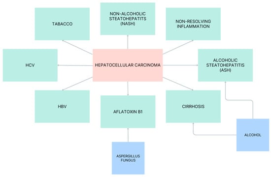 Hepatitis B virus (HBV) and hepatitis C virus (HCV) infections, excessive alcohol consumption (which, although not mutagenic, heightens cirrhosis risk), and the ingestion of aflatoxin B1 are key factors contributing to the development of hepatocellular carcinoma (HCC) (Figure 2) []. Moreover, the increasing incidence rate of hepatocellular carcinoma is becoming progressively more associated with non-alcoholic fatty liver disease (NAFLD). NAFLD encompasses a range of chronic liver conditions characterized by the accumulation of triglycerides within hepatocytes, exceeding 5% of their cytoplasmic content. Importantly, this occurs in the absence of significant alcohol consumption and is notably correlated with metabolic disorders such as obesity, insulin resistance, and type 2 diabetes. NASH (non-alcoholic steatohepatitis) is increasing, and the mortality from HCC is predicted to reach 1 million deaths annually by 2030 [,,]. In addition, smoking tobacco increases HCC by accelerating liver fibrosis, and long-term usage is strongly associated with it [,] (55% increased risk for HCC was demonstrated in a cohort study, the “Liver Cancer Pooling Project” []). Smoking brings hepatocarcinogens (e.g., 4-aminobiphenyl and acetylaminofluorene) into the body, which increases the production of proinflammatory cytokines and induces oxidative stress, triggering lipid peroxidation [].
