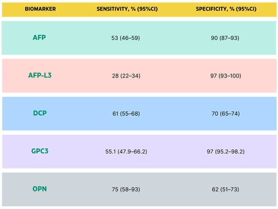 Sensitivity and specificity for AFP [], AFP-L3 [], DCP [], GPC3, and OPN [].