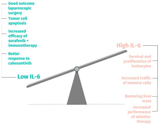 In hepatocellular carcinoma (HCC), IL-6 exhibits a dual role, with its effects being contingent upon its context. While IL-6 predominantly promotes tumor growth and advancement, it also exhibits a paradoxical impact in specific scenarios, showcasing the contrasting influences of this cytokine. This dichotomy often corresponds to different aspects of the tumor microenvironment and the tumor’s developmental stage. On the one hand, IL-6 is instrumental in bolstering the proliferation and survival of HCC cells, achieved through the activation of the JAK-STAT3 signaling pathway. This activation leads to the elevation of genes responsible for cell proliferation and the inhibition of apoptosis, thus contributing to unregulated tumor cell expansion. When it comes to angiogenesis, IL-6 propels the development of fresh blood vessels within the tumor (angiogenesis), furnishing crucial nutrients and oxygen to sustain tumor growth and enlargement. Moreover, IL-6 is correlated with heightened metastatic potential in HCC. It facilitates the process of epithelial–mesenchymal transition (EMT), empowering cancer cells to acquire invasive attributes and disseminate to distant organs [,].