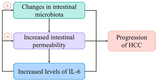 Recent research has highlighted the increasing importance of the intestinal microbiota in the development of liver disease, indicating that manipulating the bacterial population in the gut could be useful in the prevention and management of HCC []. The connection between IL-6 and the intestinal microbiota holds a crucial role in the development of HCC. A bidirectional link exists between the liver and the gut, as they communicate via the biliary tract, portal vein, and systemic circulation, forming the gut–liver axis []. Dysbiosis can potentially disrupt this system, resulting in heightened intestinal permeability. Consequently, bacterial components and detrimental agents are released within the gut–liver axis, triggering an immune response that initiates inflammation and prompts an elevated secretion of IL-6, fostering the progression of HCC []. Moreover, elevated IL-6 levels aggravate both intestinal permeability and microbiota changes [], creating a harmful cycle that contributes to the progression of HCC, as illustrated in Figure 6.