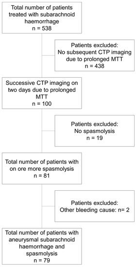 We retrospectively included all patients with SAH admitted to our tertiary-care hospital between May 2012 and December 2019 who met the following inclusion criteria: (1) patient treated for SAH, (2) the treatment was performed in our specialized neurosurgical intensive care unit, (3) the patient received CTP imaging on two consecutive days due to MTT increase in the first imaging, and (4) the patient received an intra-arterial administration of nimodipine (spasmolysis) during her or his stay in the intensive care unit. Patients were excluded from the study on the basis of the following criteria: (1) there was no CTP before the spasmolysis (on the same day) or (2) no CTP on the day following the spasmolysis was available; if (3) the image quality of a CTP imaging was insufficient for the evaluation; or (4) if there was a definite cause for subarachnoid haemorrhage other than a ruptured aneurysm (e.g., bleeding after an operation).