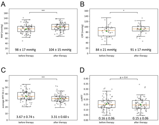 Effect of multimodal therapy on MAP, CPP, mean MTT, and cvMTT. (A) The MAP, (B) the CPP, (C) the mean MTT, and (D) the cvMTT at the time of the first and second CTP imaging are depicted in the box-and-whisker plots; boxes represent the interquartile range limited by the 25th and 75th percentile, the green triangle symbolizes the mean, the orange line the median, and the whiskers represent the maximum and minimum values. Values written out as mean ± SD (* p < 0.05; *** p < 0.001). CPP = cerebral perfusion pressure, cvMTT = coefficient of variation for MTT, MAP = mean arterial pressure, MTT = mean transit time, s = second.