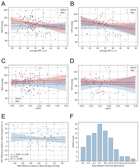 Correlations of the blood pressure and CT perfusion parameters and presentation of the temporal distribution. (A) The mean MTT showed no significant correlation with the MAP for the first CTP imaging (Dependency MAP ~ MTT CTP1: p = 0.96, R2 = −0.014) but a weak correlation for the second CTP imaging (Dependency MAP ~ MTT CTP2: p = 0.02, R2 = 0.054). (B) The mean MTT showed no significant correlation with the CPP for the first CTP imaging (Dependency CPP ~ MTT CTP1: p = 0.95, R2 = −0.026) and the second CTP imaging (Dependency CPP ~ MTT CTP2: p = 0.13, R2 = 0.035). (C) The cvMTT showed no significant correlation, neither with the MAP (Dependency MAP ~ cvMTT CTP1: p = 0.62, R2 = −0.010; Dependency MAP ~ cvMTT CTP2: p = 0.46, R2 = −0.006) nor (D) the CPP (Dependency CPP ~ cvMTT CTP1: p = 0.99, R2 = −0.026; Dependency CPP ~ cvMTT CTP2: p = 0.95, R2 = −0.026) at the first and the second CTP imaging. (E) Correlation of MTT and MAP differences between the first and the second CTP imaging (linear regression). (F) Number of days between the bleeding event and initiation of multimodal rescue therapy in the patient cohort shown as a bargraph. CPP = cerebral perfusion pressure, cvMTT = coefficient of variation for MTT, MAP = mean arterial pressure, MTT = mean transit time, R = regression coefficient.
