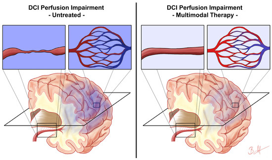 Similar to the pathophysiological concepts behind DCI, therapeutic concepts have also changed. For a long time, the so-called “triple H” therapy consisting of hypertension, hypervolemia, and haemodilution was the treatment of choice for cerebral vasospasm and DCI [24,25,26,27]. In many innovative neurovascular centres, severe DCI is now treated multimodally, mainly by induced hypertension, careful monitoring, and, when needed, administration of local intra-arterial nimodipine (spasmolysis) as rescue therapy [28,29]. Under effective multimodal therapy, mechanical treatment of hemodynamically relevant macro-vasospasm may become a relatively rare procedure.