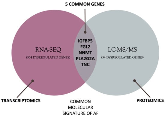 In the present multi-omics study, the intersection of RNA-Seq and mass spectrometry analysis led to the identification of five genes that constitute part of the AF molecular signature. A total of 569 DEGs were obtained from RNA-Seq data analysis, and 59 DEPs were identified from mass spectrometry data. The intersection of the two types of expression data highlighted five common genes: FGL2, IGFBP5, NNMT, PLA2G2A, and TNC. Pathway enrichment and PPI network analyses performed on these genes pinpointed the dysregulated pathways in AF.