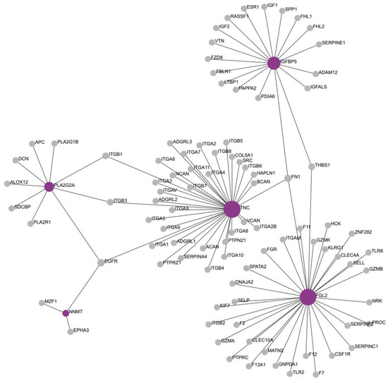 Illustration of the enriched protein network. The molecules of the molecular signature of atrial fibrillation are depicted in purple, while the molecules that enriched the network are in gray.