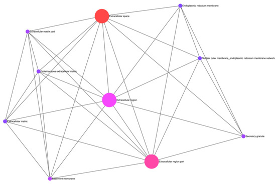 The enrichment of GO terms performed with ExpressAnalyst, from our results, allowed for the generation of two networks that showcase the possible interactions and commonalities between cellular (Figure 4) and functional components (Figure 5). These networks utilize the GO cellular component and GO biological process ontologies, respectively. Figure 4 provides a comprehensive overview of the cellular compartments in which our genes primarily exert their activity within the cell, thus shedding light on their cellular localization. Notably, our analysis highlighted the extracellular region and extracellular space as the most significant cell compartments associated with the five identified genes.