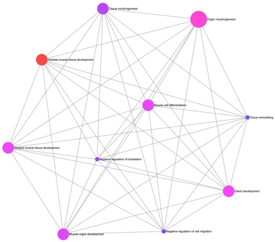 Figure 5 illustrates the biological processes enriched among the identified genes in AF and offers an informative visualization of the processes in which these genes are involved, thereby enhancing insights into the biological mechanisms underlying AF. Specifically, in our analysis, the five identified genes were involved in biological processes such as skeletal muscle tissue development, organ morphogenesis, gland development, striated muscle tissue development, muscle cell differentiation, and muscle organ development.