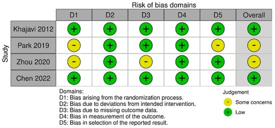 Four studies conducted in adult patients with MDD met the inclusion criteria (Khajavi et al. [43], Park et al. [44], Zhou et al. [45], and Chen et al. [46]) (Figure 1). The characteristics of the studies are presented in Table 1. The quality of the included RCTs was assessed based on the RoB2 tool (Figure 2). The risk of bias was assessed as low for the trial by Khajavi et al. [43] and Chen et al. [46], while some concerns were found for the trials by Park et al. [44] and Zhou et al. [45], mainly because of the lack of information on allocation sequence concealment (Figure 2).