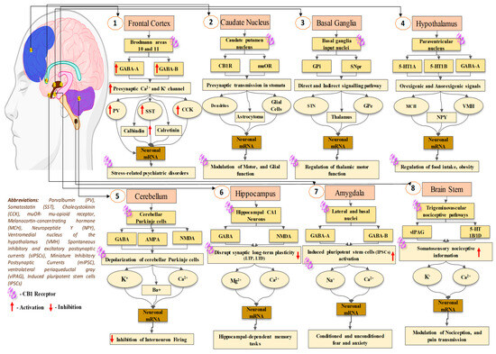 Radioligand affinity is modest in the hypothalamus, basal ganglia, solitary tract nucleus, and spinal cord, with slight inter-species differences [75]. Earlier immunocytochemical assays have demonstrated that the arrangement pattern of the CB1 receptors closely matches that of cannabinoid sites of binding, as discovered by earlier radioligand experiments. According to numerous research [76,77,78,79], these receptors have significantly higher levels of activity in certain locations, including the sense of smell, hippocampus, neocortex, and brainstem. The different arrangement of CB1 receptors in these locations correlates to the regions that are responsible for the different effects of cannabinoid agonists, such as motor control, body position, hypothermia, memory and learning, hunger, vomiting, and alleviation of pain. This finding lends strong credence to the hypothesis that cannabinoids’ activities in the cerebral cortex are primarily mediated by CB1 receptors. CB1 receptor positivity is primarily associated with nerve fiber networks and axon junctions when evaluated at the cellular level, with little activity in neurons and cell nuclei. The above distribution pattern corresponds to the idea of a presynaptic mode of activity.