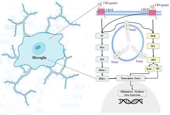 Enhanced CB2 receptor manifestation and expression could indicate an aggressive approach to limit or modulate the inflammatory process. The analogy might be related to the way tumor suppressor genes limit cell proliferation and how ephrin receptors in the brain can have different actions depending on the conditions [195]. Several studies have shown that CB2 receptor stimulation helps to reduce short-term inflammation [196,197,198,199,200,201]. Whenever the CB2 receptor system is activated, it suppresses neuroinflammatory signaling pathways and restores glial activity to normal—transitioning from a pro-inflammatory to an anti-inflammatory condition. CB2 receptors additionally influence the triggering of ERK1/2 (extracellular signal-regulated protein kinases) [202]. Earlier studies also evidence that toll-like receptor 2 (TLR2) and TLR4 have been linked to ERK1/2 amplification [203]. Experimental evidence shows that anandamide, which is an endocannabinoid, works via the MAPK pathway inside the CNS immune system. This strategy attempts to reduce the extent of inflammation and limit immunological responses associated with neurotoxicity [202].