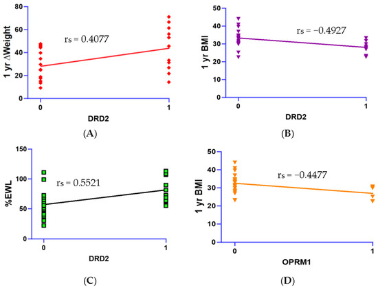 Scatterplots visualizing correlations between SNPs and body weight data. (A) Positive correlations between single DRD2 SNPs and 1 yr ∆Weight (rs = 0.4077, p < 0.05). (B) Negative correlations between single DRD2 SNPs and 1 yr BMI (rs = −0.4927, p < 0.05). (C) Positive correlation between DRD2 SNPs and %EWL (rs = 0.5521, p < 0.05). (D) Negative correlation between OPRM1 SNP and 1 yr BMI (rs = −0.4477, p < 0.05).