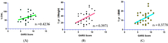Correlations between overall GARS score. (A) %EWL (rs = 0.4236, p < 0.05). (B) 1 yr ∆Weight (rs = 0.3971, p < 0.05). (C) 1 yr ∆BMI (rs = 0.3778, p < 0.05).