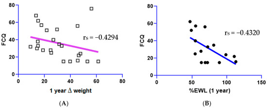 Negative correlations between (A) FCQ and (B) 1 yr ∆Weight (rs = −0.4294, p < 0.05) and %EWL (rs = 0.4320, p < 0.05).