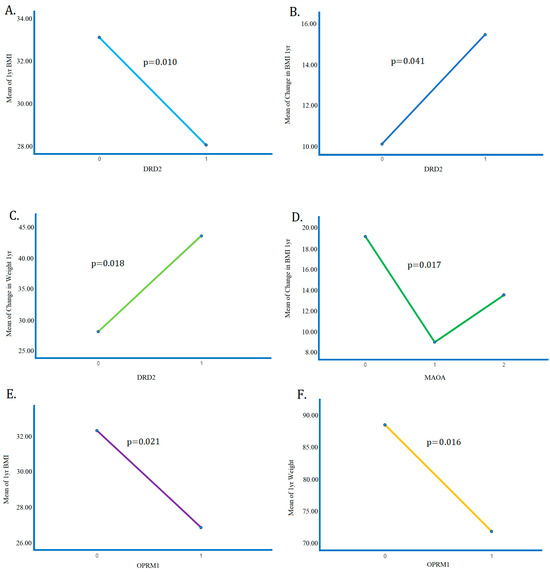 ANOVA results detailing the significant differences in means of (A) 1-year BMI between subjects with 0 and 1 copy of the DRD2 gene (p = 0.010); (B) ∆BMI between subjects with 0 and 1 copy of the DRD2 gene (p = 0.041); (C) ∆Weight between subjects with 0 and 1 copy of the DRD2 gene (p = 0.018); (D) ∆BMI between subjects with 0 and 1 copies of the MAOA gene (p = 0.017). Note: difference in mean insignificant between 0–2, 1–2 copies of the MAOA gene. (E) 1-year BMI between subjects with 0 and 1 copy of the OPRM1 gene (p = 0.021). (F) 1-year weight between subjects with 0 and 1 copy of the OPRM1 gene (p = 0.016).