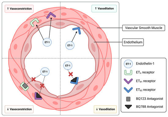 Schematic diagram of the endothelin-1 system, including its vasoconstrictive and dilatory actions on arteries. This figure highlights the antagonism of the endothelin-1 receptors, ETA and ETB, using BQ123 and BQ788 antagonists, respectively (indicated by the red X).