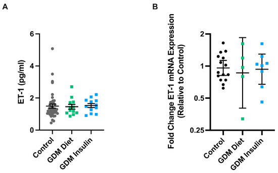 The concentration of circulating ET-1 was measured in maternal plasma collected from patients diagnosed with GDM who were treated with diet (n = 12) or insulin (n = 12) and normotensive pregnant gestation-matched control patients (n = 42). Plasma levels were measured using the Human Endothelin-1 ELISA Kit (R&D systems, Minneapolis, MN, USA), according to the manufacturer’s instructions.
