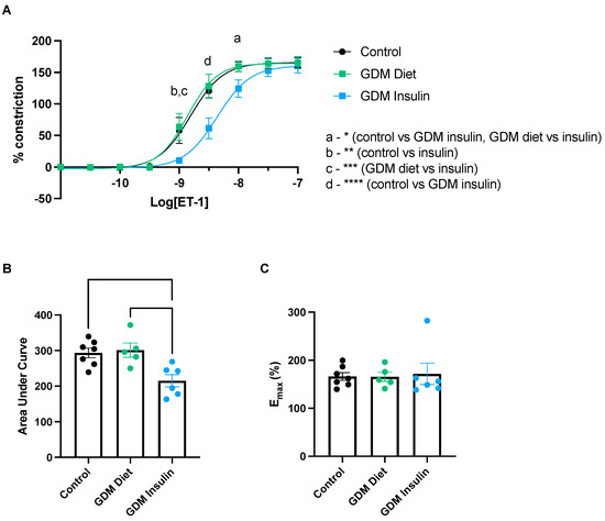 We next assessed whether the vascular response to ET-1 is altered in pregnancies complicated by GDM. ET-1 induced constriction in omental arteries collected from GDM patients treated with insulin was significantly reduced compared to omental arteries from diet-treated GDM patients or healthy controls; at dose 10−9 (normal vs. GDM insulin and GDM Diet vs. GDM insulin, p = 0.001), 10−8.5 (normal vs. GDM insulin and GDM Diet vs. GDM insulin, p < 0.0001), and 10−8 (normal vs. GDM insulin, p = 0.022; and GDM Diet vs. GDM insulin, p = 0.035) of ET-1 (Figure 3A). Analysis of the area under the curve (corresponding to total response over all doses of ET-1 assessed; Figure 3B) further demonstrated the total ET-1 induced constriction in omental arteries from GDM patients treated with insulin was significantly less than from patients with GDM treated with diet (p = 0.009), and healthy controls (p = 0.009). Maximum constriction (Figure 3C) did not differ significantly between the groups. These data infer that insulin treatment of GDM patients changes the vasoreactivity of their omental arteries when exposed to ex vivo ET-1.