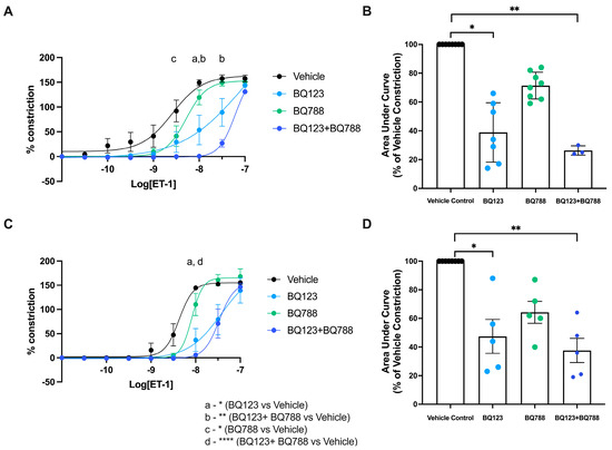 Given we observed a decreased constrictory response to ET-1 in vessels collected from GDM pregnancies treated with insulin, we next set out to investigate whether differences in levels of ET-1 receptors might be responsible for this altered response. We observed that both antagonists, BQ123 and BQ788, singularly and in combination, were successful in dampening constriction induced by ET-1 in healthy pregnant arteries. At dose 10−8.5 M (BQ788 vs. vehicle, p = 0.034), 10−8 M (BQ123, p = 0.038, and BQ123 and BQ788, p = 0.003) and 10−7.5 M (BQ123 and BQ788, p = 0.007) of ET-1, the constriction produced with the antagonists respectively was significantly less than the vehicle (Figure 4A). Therefore, the area under the curve (Figure 4B) also indicates decreased total constriction following pre-treatments with antagonist BQ123 (p = 0.035) and BQ123 + BQ788 (p = 0.008) compared to vehicle control. In contrast, only the antagonistic actions of BQ123 alone (p = 0.014) and BQ123 + BQ788 (p < 0.0001) were successful in decreasing ET-1 induced constriction at dose 10−8 M in omental arteries collected from GDM pregnancies treated with insulin (Figure 4C). The area under the curve relative to vehicle control was significantly decreased with BQ123 (p = 0.031) and BQ123 + BQ788 (p = 0.002) pre-treatment (Figure 4D).