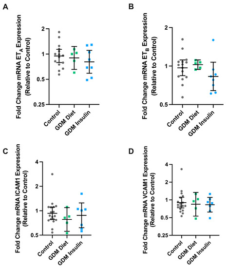 We next set out to determine whether the differences in response to ET-1 in pregnancies complicated by GDM (managed with insulin treatment) might be due to changes in the expression of the ET- receptors. Expression of ETA and ETB mRNA was not altered in omental arteries from pregnancies complicated by GDM treated with insulin or diet intervention, compared to healthy gestation-matched controls (Figure 5). As GDM is associated with endothelial dysfunction, we also assessed whether GDM might alter the expression of endothelial dysfunction markers ICAM1 and VCAM1. However, there were no significant differences observed in the mRNA expression of VCAM1 or ICAM1 in arteries collected from pregnancies complicated by GDM with either diet or insulin intervention.