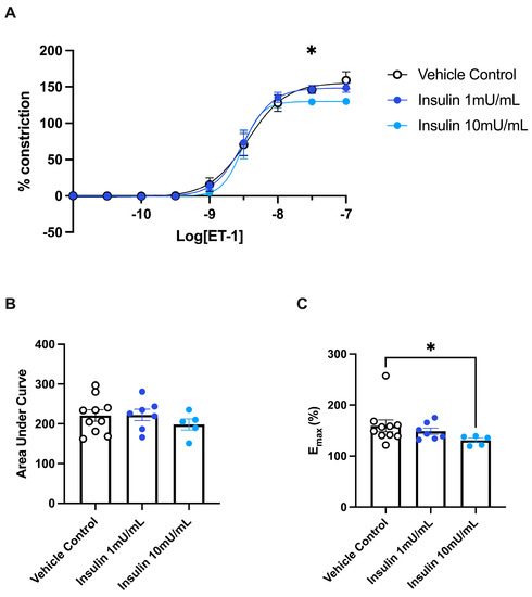 To investigate whether the difference in ET-1-induced constriction in GDM insulin-treated patients was due to the use of insulin as a treatment type, we next investigated the effect of exposing healthy pregnant arteries to insulin on ET-1-driven constriction. There were no significant changes in the constriction induced by ET-1 in omental arteries incubated with 1 mU/mL insulin (Figure 6). However, in arteries incubated with 10 mU/mL insulin we observed reduced vascular constriction to ET-1 compared to vehicle control. At dose 10−7.5 (insulin 10 mU/mL compared to control, p = 0.029) of ET-1, the constriction induced was significantly less (Figure 6A). The maximum constriction induced by ET-1 following incubation in 10 mU/mL insulin was significantly less than the vehicle control (p = 0.013; Figure 6C). However, the analysis of the area under the curve revealed that there was no significant difference in ET-1-induced constriction between any of the treatment groups (Figure 6B). Taken together, this infers that treatment of omental arteries with 10 mU/mL of insulin for a short period of time (30 min) can alter the vasoreactivity of maternal resistance arteries to ET-1 in an ex vivo setting.