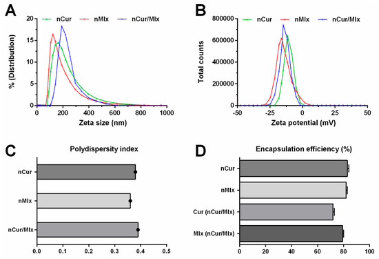 Characterization of curcumin and meloxicam mono and dual-compound-loaded nanoparticles. (A) Zeta size, (B) zeta potential, (C) polydispersity index, and (D) encapsulation efficiency of nanoparticles. Cur, curcumin; Mlx, meloxicam; nCur, curcumin-loaded nanoparticles; nMlx, meloxicam-loaded nanoparticles; nCur/Mlx, curcumin plus meloxicam co-loaded nanoparticles.