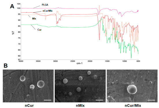 FT-IR is a key analytical method that should be thoroughly studied during nanoparticle synthesis to find out any physical and chemical interactions that might occur between the polymeric material and encapsulated compound, as well as to assure compatibility between all components of nanoparticles [50]. The FT-IR spectrum of nCur/Mlx demonstrated the presence of functional groups of PLGA and free compounds, including curcumin and meloxicam, indicating that no chemical interaction occurred between polymer and loaded compounds (Figure 2A). Further, SEM results showed spherical and smooth-surfaced nanoparticles with limited particle size dispersion. The surface morphology of nCur, nMlx, and nCur/Mlx showed no significant differences (Figure 2B). SEM size distributions were substantially identical to DLS results. A few nanoparticles with porous surfaces were also discovered, which is anticipated to aid medication solubility and subsequent polymer breakdown [51].