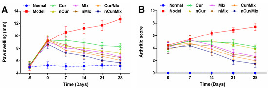 Adjuvant injection into the sub-plantar area of each rat’s paw significantly (p ≤ 0.05) induced paw swelling (Figure 3A) and arthritic score (Figure 3B), which were substantially increased from day 0 to 28 of the experiment, as compared to normal group. Maximum paw swelling and arthritic score in the model group were recorded on the 28th day of the experiment. The treatment of arthritic rats with curcumin, meloxicam, curcumin plus meloxicam, nCur, nMlx, and nCur/Mlx demonstrated a gradual reduction in these parameters from day 7 onwards in comparison to the model group (p ≤ 0.05). Furthermore, a notable improvement in reducing paw swelling and arthritic score was observed in nCur, nMlx, and nCur/Mlx-treated groups compared to the pure compound-treated groups; however, nCur/Mlx showed the highest attenuating effects among all treatments.