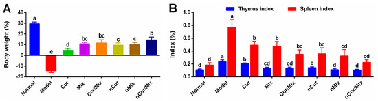 (A) Change in body weight and (B) immune organ index of thymus and spleen of arthritic rats treated with curcumin and meloxicam mono and dual-compound-loaded nanoparticles after 28 days of experiment. Data were analyzed using one-way ANOVA and Tukey’s test (mean ± SD, n = 6). Different alphabets (a–e) indicate significant (p ≤ 0.05) differences between groups. Cur, curcumin; Mlx, meloxicam; Cur/Mlx, curcumin plus meloxicam; nCur, curcumin-loaded nanoparticles; nMlx, meloxicam-loaded nanoparticles; nCur/Mlx, curcumin plus meloxicam co-loaded nanoparticles.