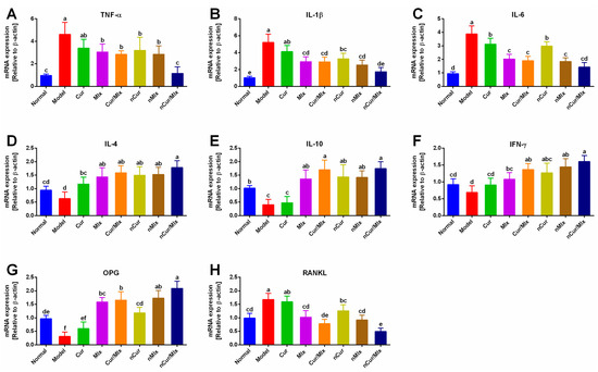 Relative mRNA expressions of pro-/anti-inflammatory cytokines and OPG/RANKL in paw tissue of adjuvant-induced arthritic rats treated with curcumin and meloxicam mono and dual-compound-loaded nanoparticles. (A) TNF-α, (B) IL-1β, (C) IL-6, (D) IL-4, (E) IL-10, (F) IFN-γ, (G) OPG, and (H) RANKL. Data were analyzed using one-way ANOVA and Tukey’s test (mean ± SD, n = 6). Different alphabets (a–f) indicate significant (p ≤ 0.05) differences between groups. Cur, curcumin; Mlx, meloxicam; Cur/Mlx, curcumin plus meloxicam; nCur, curcumin-loaded nanoparticles; nMlx, meloxicam-loaded nanoparticles; nCur/Mlx, curcumin plus meloxicam co-loaded nanoparticles; TNF-α, tumor necrosis factor-α; IL-1β, interleukin-1β; IL-4, interleukin-4; IL-6, interleukin-6; IL-10, interleukin-10; IFN-γ, interferon-γ; OPG, osteoprotegerin; RANKL, receptor activator of nuclear factor kappa-Β ligand.