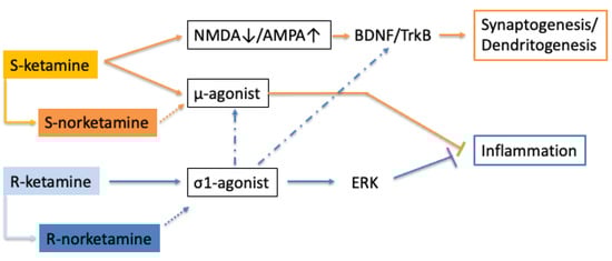 S-ketamine generates antidepressant activity via NMDA blockade and μ-opioid receptor activation, which, respectively, lead to synaptogenesis and anti-inflammatory efficacy. R-ketamine stimulates σ1 receptors, which also causes an anti-inflammatory and antidepressant response. S-norketamine and R-norketamine are primary metabolites. Their contribution to the pharmacological profile remains to be determined (dotted arrow). There is limited information that σ1 agonists may potentiate μ-opioid receptor and TrkB-mediated responses (indicated by a dash-dotted arrow).
