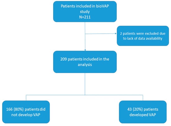 Of 211 patients consecutively included in the BioVAP study, 209 were analyzed (Figure 1). Baseline characteristics are described in Table 1, overall, and by the VAP diagnostic status. Of 209 patients, 73 (34.9%) patients presented an infection at admission to the ICU (pulmonary N = 44 or non-pulmonary n = 29). The median age was 63 years, and the most common comorbid conditions were heart failure, diabetes, and chronic obstructive pulmonary disease (COPD). In 158 (75.6%) patients, the main cause of hospital admission was medical and the main cause of mechanical ventilation was respiratory failure (40.7%).