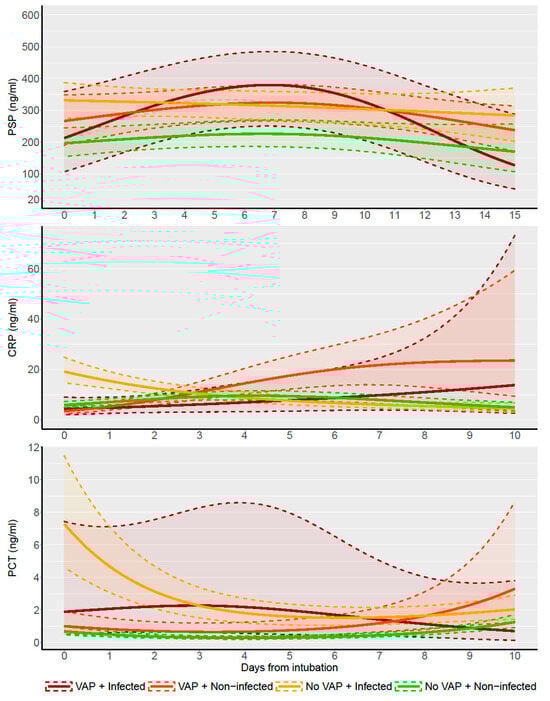 Trends fitted by means of mixed-effects models. CRP, C-reactive protein; PCT, procalcitonin; PSP, pancreatic stone protein; VAP, ventilator-associated pneumonia.