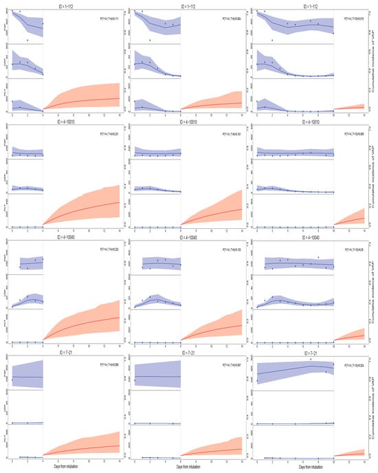 The posterior mean and 95% credible band of the longitudinal biomarkers trend (blue) and the probability of VAP diagnosis (red) for selected patients with the IDs 1–112 (infected at ICU admission and without VAP diagnosis), 4–10010 (non-infected at ICU admission and without VAP diagnosis), 4–10040 (non-infected at ICU admission and with VAP diagnosis), and 7–21 (infected at ICU admission and with VAP diagnosis) are shown. The value of the probability at the upper right of each graphic is the subsequent posterior mean of VAP risk at 14 days from intubation, conditioned to VAP having not been diagnosed at 4, 6, or 10 days from intubation.