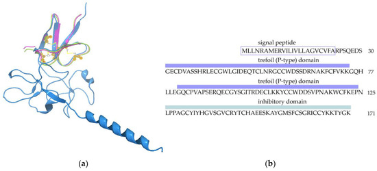 Sea anemone mucin structure. (a) Overlay of the spatial structures of inhibitory domains was performed using the CLC genomic workbench (CLC Bio, Qiagen): blue—A. tenebrosa mucin (A0A6P8IY78 UniProtKB, 171 aa); green—magnificamide 1-1 (44 aa); pink—helianthamide (A0A0 × 1KGZ5 UniProtKB, 44 aa). (b) Domain organization of A. tenebrosa mucin: violet—trefoil domains (44 aa); turquoise—inhibitory domain (46 aa).