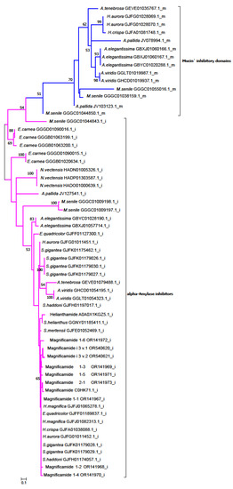 The unrooted phylogenetic tree of α-amylase inhibitors (helianthamide and magnificamide) and their homologs (i) and mucin-inhibitory domains (m) from sea anemones. Numbers next to branches represent bootstrap support. The ML tree was produced by the IQ-TREE web server (version 1.6.12), according to the WAG + I + G4 model. Β-defensin-like inhibitor branches are shown in pink, and mucin-inhibitory domains are shown in blue.