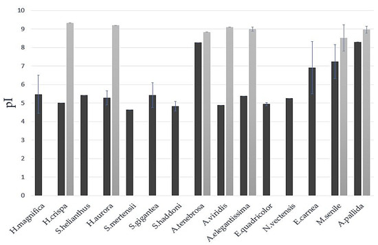 Almost all β-defensin-like inhibitors in the non-mucin group have an isoelectric point (pI) of 4.5–5.7 (except for E. carnea ones, pI ~ 6.9), while all mucin-inhibitory domains exhibit pI values of 8.5–9.3 (Figure 5). The inhibitors found in these species can be divided into two groups: pI~5 (from H. crispa, H. aurora, A. viridis, and A. elegantissima) and ~ 7.5 (from A. tenebrosa, M. senile, and A. pallida).