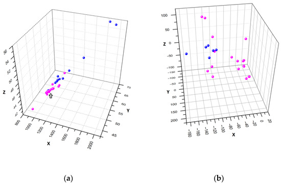 Three-dimensional representation of α-amylase inhibitors (purple spheres) and mucin-inhibitory domains (blue spheres) from sea anemones. (a) A 3D scatter plot of sequence coordinates prepared by the NULA algorithm. Magnificamides’ locations are shown by the arrow. (b) A 3D scatter plot of the coordinates of the superimposed molecules’ dipole moments.