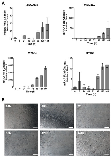 Six-day (144 h) time course of DUX4 and differentiation marker expression in primary human skeletal muscle cells (pHSMCs) from Donor 1 by (A) TaqMan based real-time PCR, which demonstrates a marked increase in both DUX4 marker (ZSCAN4 and MBD3L2) and differentiation markers (MYOG and MYH2) expression beginning after 72 h. Bars show mean ± SEM (standard error of the mean) of two technical replicates at each timepoint, statistical significance not calculated. This timeline is consistent with the appearance of fused myotubes (B) in bright field images of pHSMCs from Donor 1 after 72–96 h under differentiating conditions. All images were taken at 10× magnification, scale bars = 100 µm.